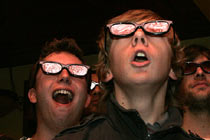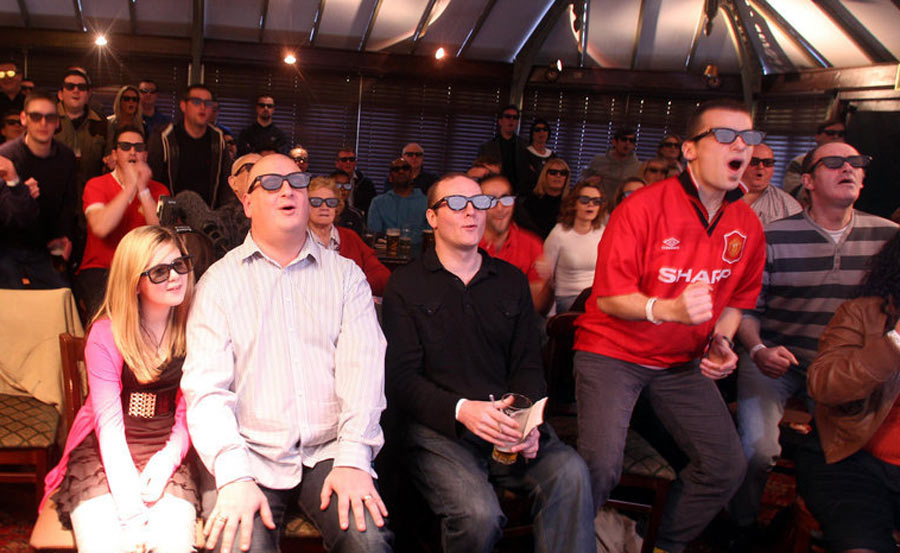英國曼徹斯特,09/10英超第24輪,阿森納Vs曼聯,曼聯球迷觀看3D直播。北京時間2月1日,英國體育頻道首次使用3D技術對阿森納與曼聯的比賽進行電視直播。據悉,今年南非世界杯也將進行3D轉播。
