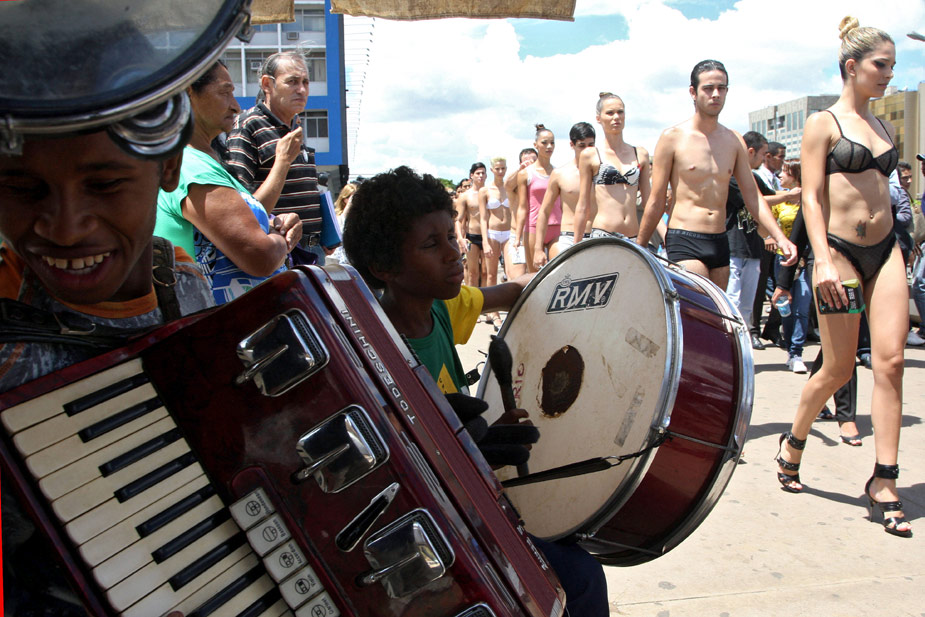 當地時間2月9日,巴西首都巴西利亞的一座公共汽車站,一群身穿性感內衣的模特招搖過市,吸引大批路人注目,當天是巴西的內衣日。