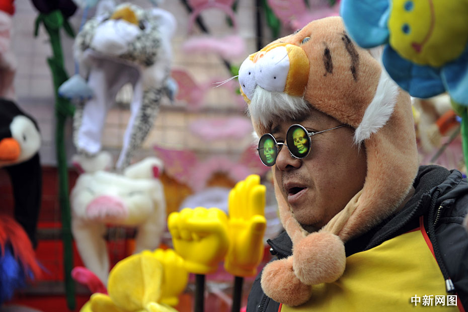 2月14日,農歷正月初一,北京各大傳統廟會、洋廟會爭相開幕,許多游客頭戴虎年飾品開心游廟會。中新網記者 金碩 攝
