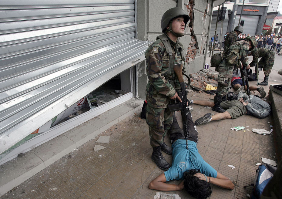3月2日,智利軍警在街頭維持秩序。智利總統(tǒng)巴切萊特當日說,政府派往災(zāi)區(qū)維持治安的軍人數(shù)量已達14000人,地震重災(zāi)區(qū)的搶劫現(xiàn)象已得到控制。圖片來源:中國新聞網(wǎng)