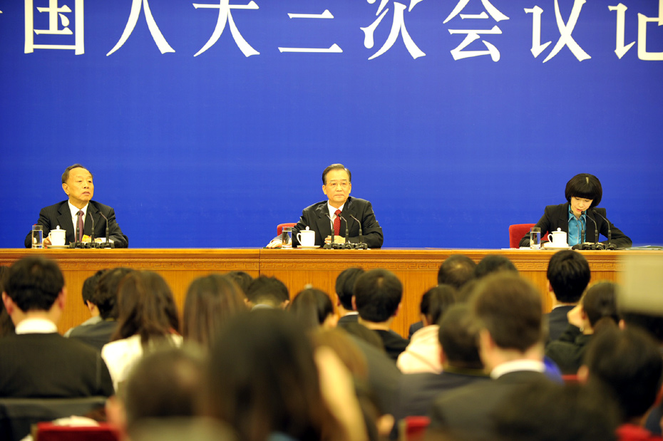 3月14日上午,國務院總理溫家寶在人民大會堂三樓金色大廳與采訪十一屆全國人大三次會議的中外記者見面并回答記者提出的問題。中新網記者 楊威 攝 圖片來源:中國新聞網