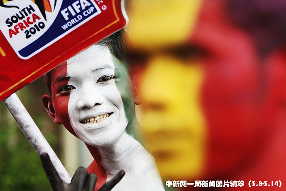 周一在印尼雅加達(dá)舉行的FIFA世界杯足球賽宣傳活動上,人們在身上涂上了參賽國家的國旗。圖片來源:中國新聞網(wǎng)