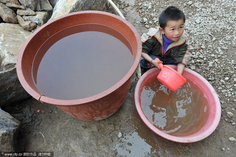 3月16日,貴州省開陽縣城關鎮青西村村民付燕子帶著孩子在水庫底找水。連日來,貴州省旱情加劇,貴陽市郊開陽縣城關鎮居民飲水源青西村水庫幾乎干涸。貴州省開陽縣城關鎮青西村一兒童在接水。吳東俊/CFP