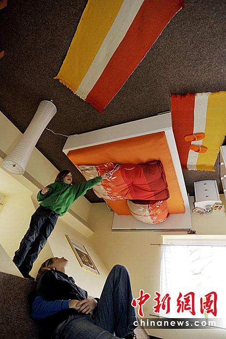 3月30日,德國蓋托夫市“瘋狂的房子”面向公眾開放。該房屋整個顛倒里面的家具也是被釘在屋頂上的。圖片來源:中國新聞網