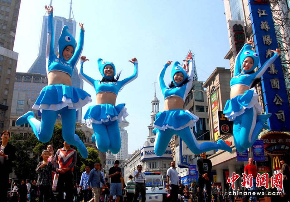 上海南京路步行街,幾名“海寶”打扮的少女出現(xiàn)在街頭,引起不少路人和游客的觀看。這是上海商貿(mào)旅游學校的女學生扮演的“歡樂海寶”,她們參加演出后,在街頭通過生動的形體語言來展示世博會的可愛吉祥物--“海寶”。 楊毅CFP