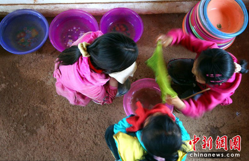 劉蕙玫和兩個同學一起共用一個盆水洗臉,而這“盆”水只是兩杯水。沙浪 攝
