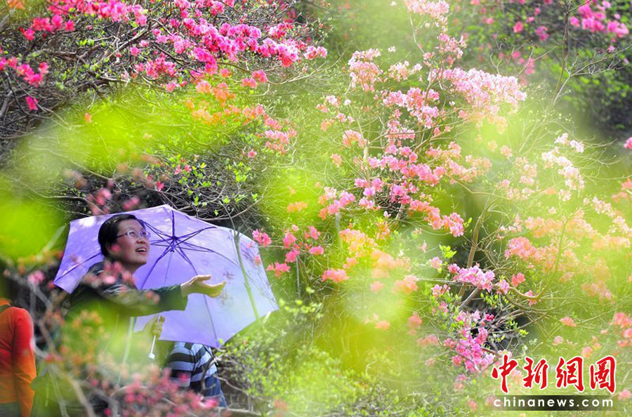 2010年4月4日,湖北武漢市黃坡區云霧山萬畝杜鵑花競相怒放,迎接八方游客踏青賞花。宋建春/CFP