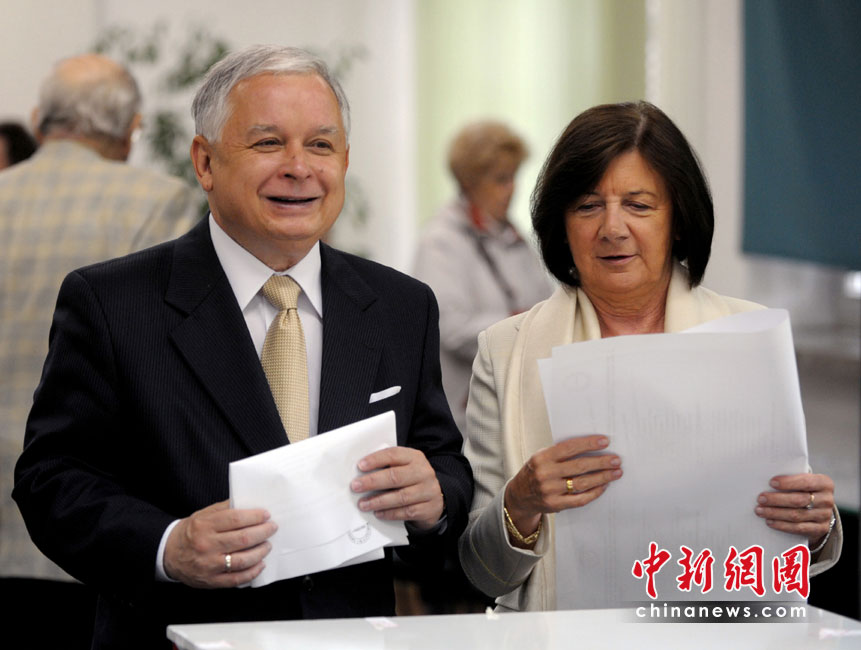 波蘭總統(tǒng)卡欽斯基乘坐的一架圖-154飛機(jī)10日在俄羅斯斯摩棱斯克州北部一軍用機(jī)場(chǎng)降落時(shí)失事,至少87人死亡。卡欽斯基本人被確認(rèn)身亡。圖為2009年波蘭總統(tǒng)卡欽斯基與妻子在歐洲議會(huì)選舉上投票。