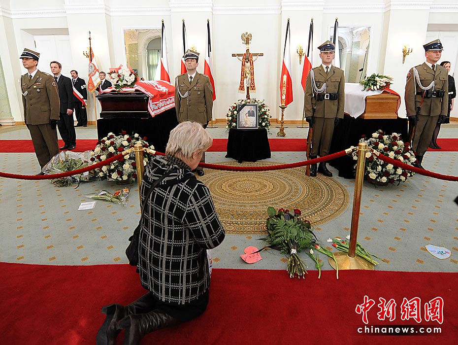 當地時間4月13日14時,波蘭總統夫婦的遺體被安放在總統府最大的圓柱廳供民眾瞻仰和悼念。總統卡欽斯基及其夫人的葬禮將于18日舉行。圖片來源:中國新聞網
