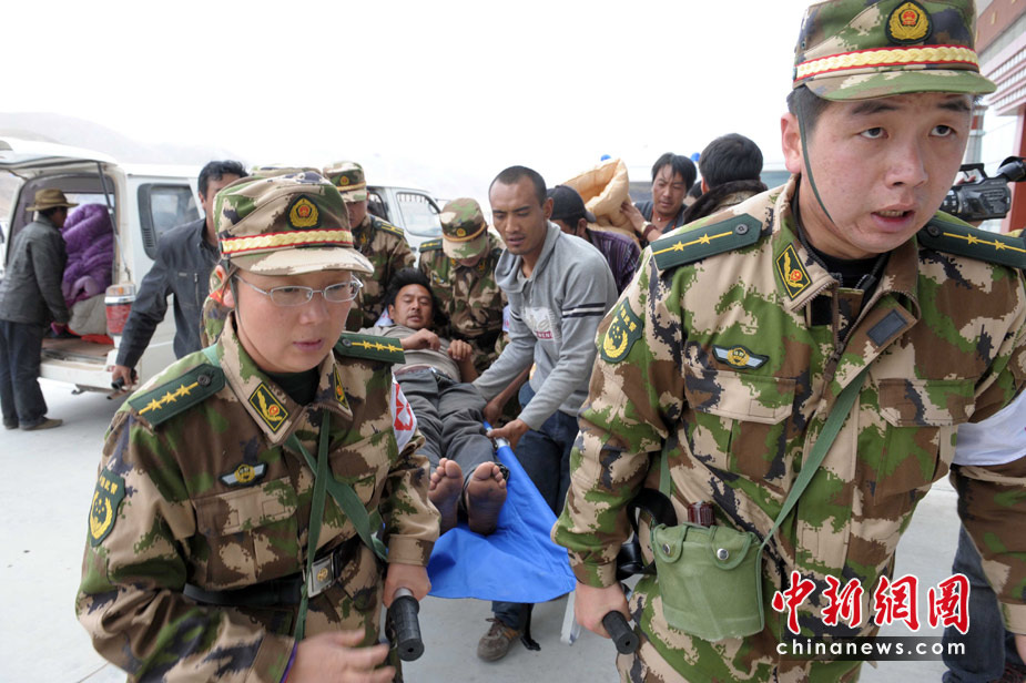4月15日下午,云南邊防總隊醫療救援隊剛下飛機立即投入傷員轉移工作。圖為官兵們在玉樹機場從救護車上抬下地震危重傷員,進行轉移安置和治療。中新社發 陳文 攝