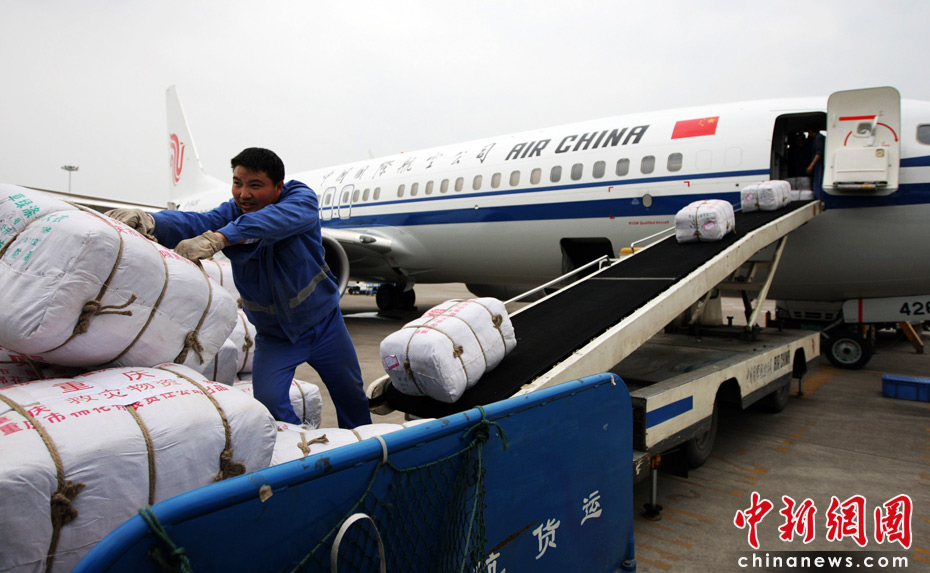 4月15日,重慶江北國際機場停機坪上,工人們緊張地將救援物資裝運上飛機準備起運青海地震災區。青海玉樹縣地震發生后,中共中央政治局委員、重慶市委書記薄熙來庚即作出重要批示,要求重慶全力以赴支援災區,根據災區需求提供支援。中共重慶市委、市政府第一時間向青海省政府發去了慰問電,并支援災區300萬元和大批救援物資,首批救援物資于當日下去從重慶起飛空運至災區。中新社發 郭晉嘉 攝