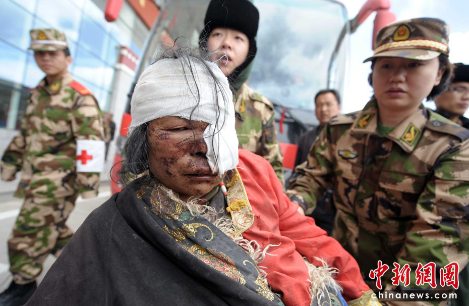圖為4月15日下午,玉樹地震重傷員用各種交通工具送達(dá)機(jī)場,廣東邊防總隊(duì)醫(yī)療救援隊(duì),用被褥接轉(zhuǎn)傷員。中新社發(fā) 陳文 攝