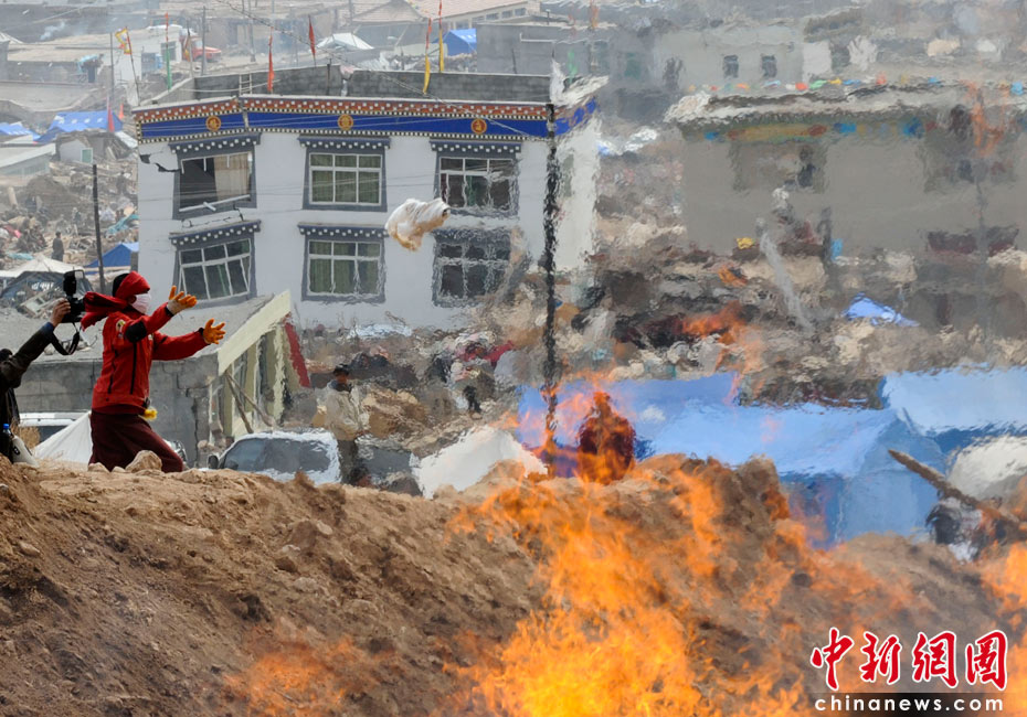 4月17日,青海省玉樹縣結古鎮附近的山坡上,眾多地震遇難者遺體被火葬。當日,為妥善及時處理遇難人員遺體,預防災區疫情的發生與流行,青海出臺地震遇難人員遺體處理意見,強調在處理遺體時要尊重少數民族喪葬習俗,尊重死者尊嚴。圖為眾多僧侶為逝者祈禱。中新社發 廖攀 攝