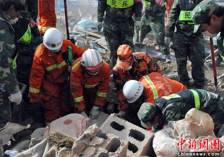 西藏公安消防部隊近日赴玉樹抗震救災分隊103名官兵分成5個小組在不同區域展開搜救。圖為西藏消防救援官兵與當地民兵一起救援。中新社發 劉毅 攝