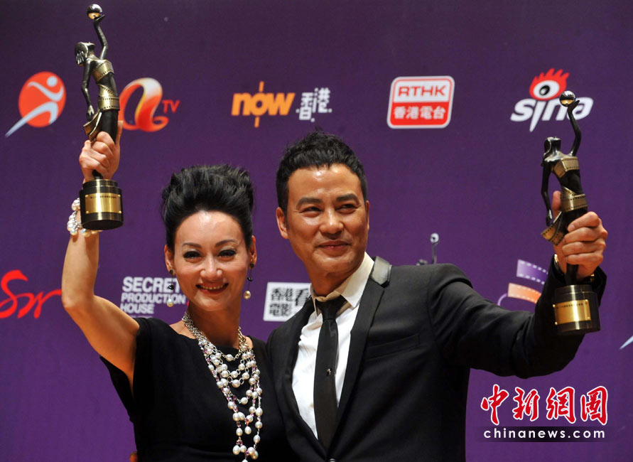 4月18日晚,“第二十九屆香港電影金像獎”頒獎典禮在香港文化中心大劇院隆重舉行。分別奪得最佳男女主角獎項的香港藝人任達華及惠英紅向媒體展示獎項并合照。中新社發 鄧慶樂 攝