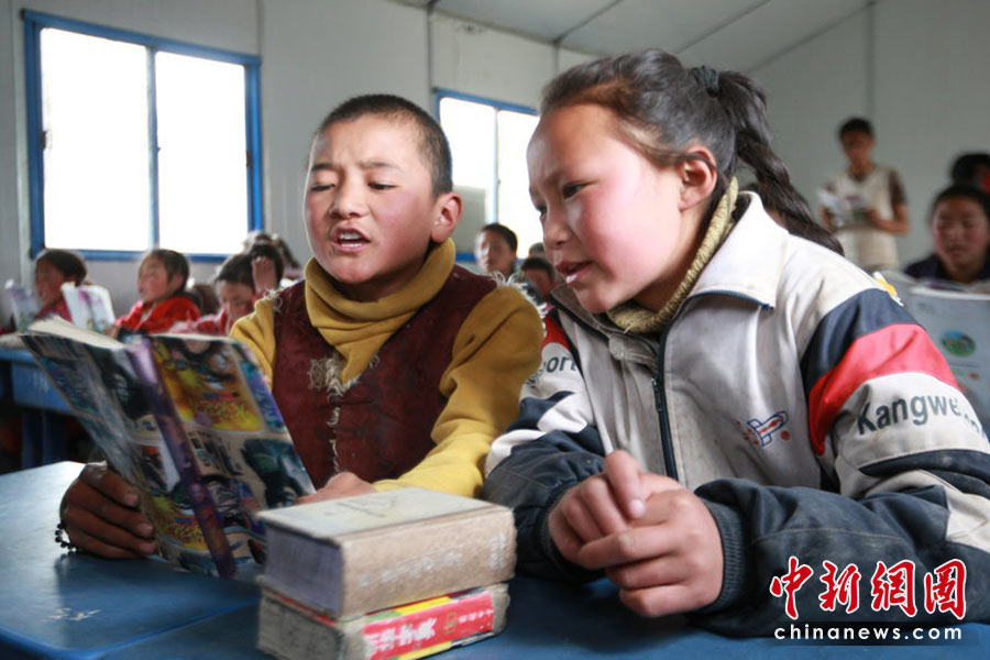 4月18日,70多名孩子在地震四天后重新走進了課堂,玉樹州孤兒學校成為了地震災區(qū)第一所復課的學校,剛完成帳篷搭建的青海省玉樹藏族自治州第一民族中學3個年級的學生也開始復課。青友 攝