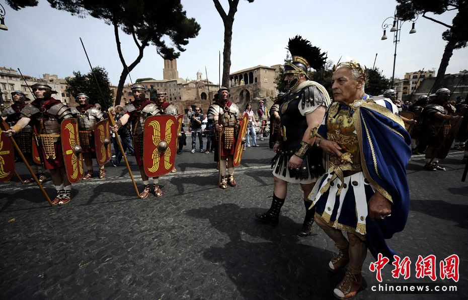 4月18日,意大利羅馬,男子打扮成武士在圓形競技場附近參加游行,慶祝羅馬建城2763周年。圖片來源:中國新聞網