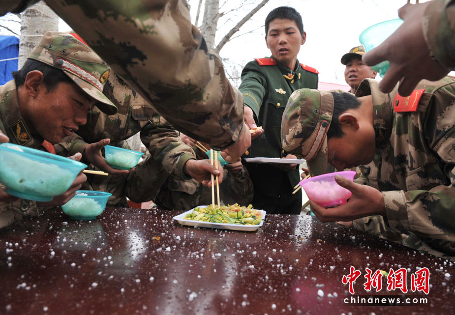 4月20日中午時分,玉樹地震災區突然雷雹交加,正在現場救援的青海武警總隊官兵只能在冰雹中吃午餐。中新社發 賈國榮 攝