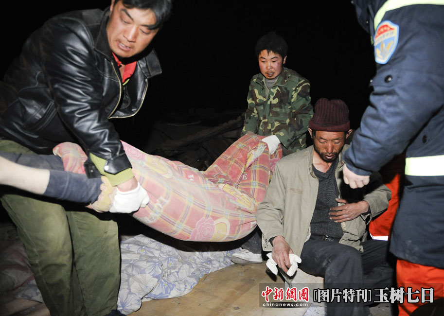 玉樹縣的民眾在中國國際救援隊隊員的幫助下連夜展開救援。中新社發 廖攀 攝
