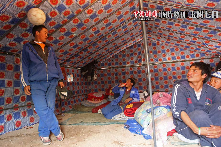2010年4月19日,青海玉樹縣結古鎮玉樹縣第一民族中學的學生宿舍帳篷內,德尕扎西(左)在其他同學面前表演球技,稱自己是“C羅”。中新社發 盛佳鵬 攝