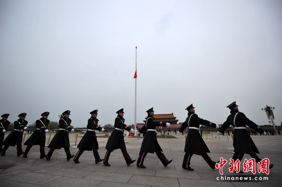 4月21日早晨,北京天安門廣場下半旗向玉樹地震遇難者致哀。中新網記者 金碩 攝