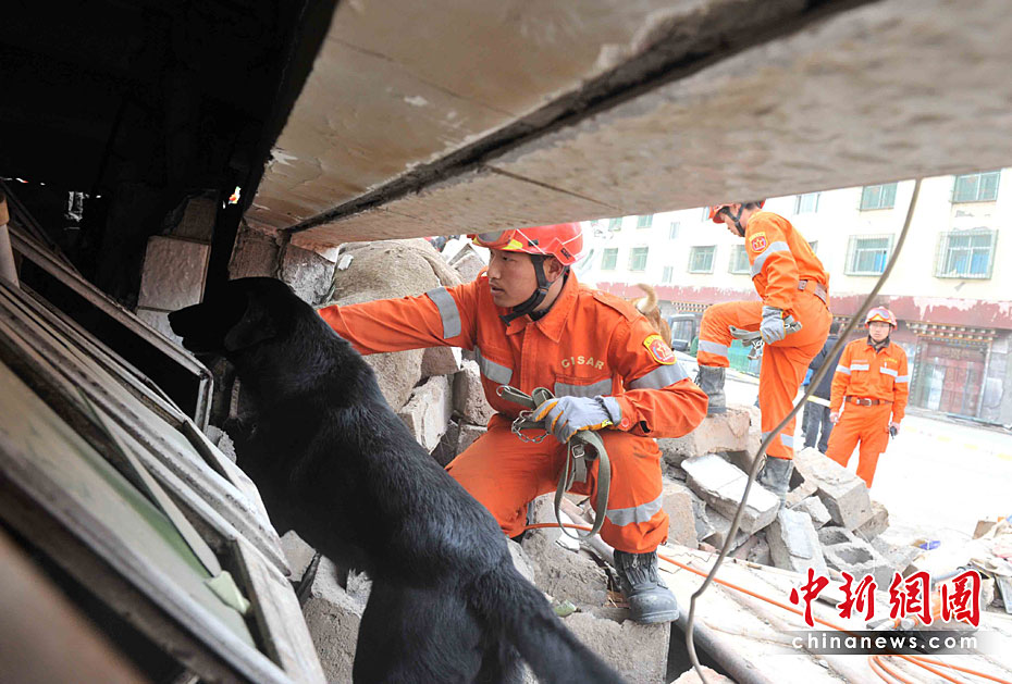 名貴的黑貝犬是中國(guó)國(guó)家救援隊(duì)趕赴青海玉樹(shù)地震災(zāi)區(qū)6只搜救犬隊(duì)成員之一,身價(jià)近百萬(wàn)元人民幣。4月21日清晨八時(shí)許,它在救援隊(duì)員的帶領(lǐng)下,到玉樹(shù)地震災(zāi)區(qū)中心商業(yè)街廢墟里,四處奔波,盡職盡力尋找生命跡象。10時(shí)后,他和救援隊(duì)員都出現(xiàn)高原反應(yīng),暫時(shí)休整,準(zhǔn)備再戰(zhàn)。賈國(guó)榮 攝
