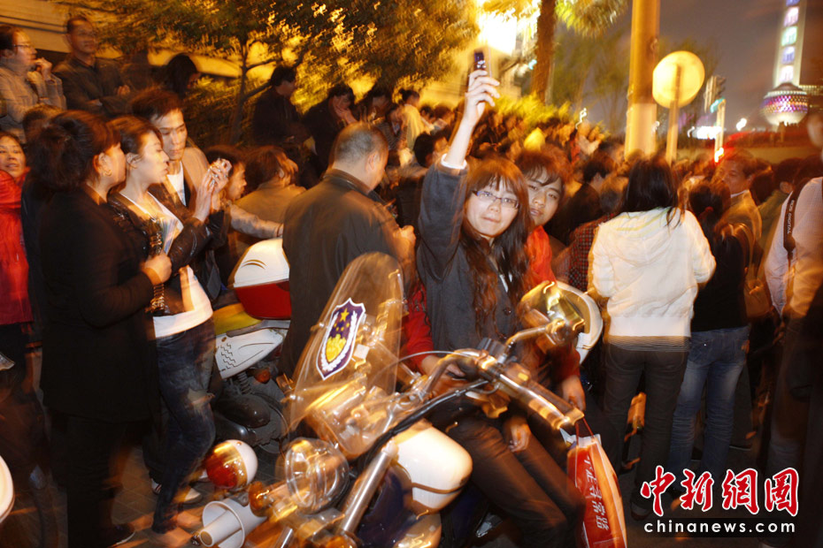 4月30日,上海世博會開幕,黃浦江畔火樹銀花姹紫嫣紅,這座夢想成真城市的千萬居民,在這個注定難忘的夜晚盡情燃燒和釋放著自己的激情。圖為一對情侶在擁擠的外灘合影。中新社發 盛佳鵬 攝
