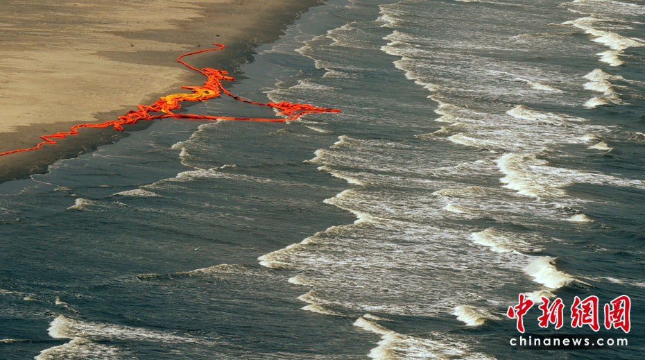 4月30日,在美國路易斯安那州海岸,為阻隔原油擴散而設的護欄帶被海風浪沖到岸邊。當天,美國總統奧巴馬下令調查墨西哥灣石油鉆井平臺爆炸事件,以避免將來類似事件再次發生。平臺爆炸沉沒后泄漏的原油當天已漂至美國沿岸。圖片來源:中國新聞網