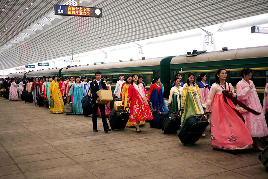 5月2日,載著198名朝鮮紅樓夢劇組演員的專列駛入丹東口岸。由朝鮮國家級藝術團-血海歌劇團創作的歌舞劇《紅樓夢》將于5月6日至9日登陸北京電視臺大劇院,這個超大演員陣容亦創下近年來華國外演出人數之最。圖片來源:新華網
