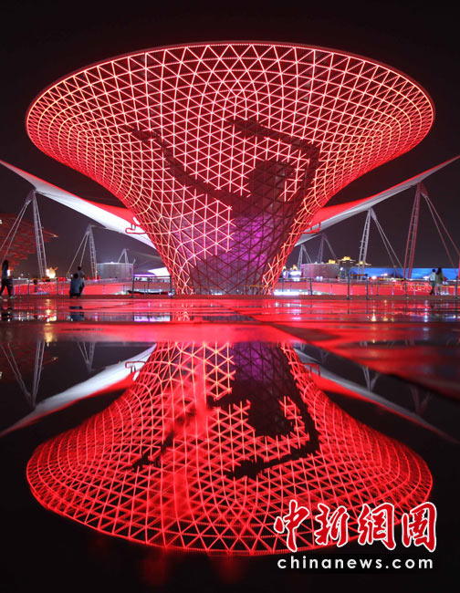 夜幕下的上海世博園區處處流露光華與璀璨,世博軸上的“陽光谷”成為一個個流光溢彩的“夜光杯”,以不同色調交織成流動的光影旋律,給游客們帶來難以忘懷的感受。圖為“陽光谷”上顯示出一個舞蹈女子的燈光圖案。中新社發 宗金柱 攝
