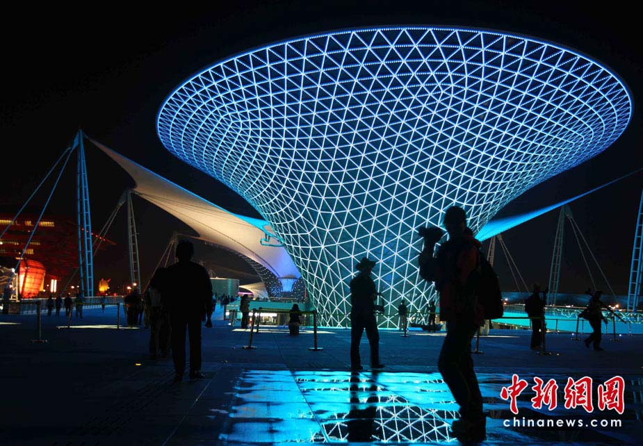 夜幕下的上海世博園區處處流露光華與璀璨,世博軸上的“陽光谷”成為一個個流光溢彩的“夜光杯”,以不同色調交織成流動的光影旋律,給游客們帶來難以忘懷的感受。中新社發 宗金柱 攝