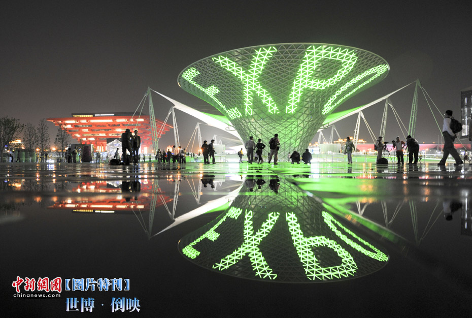 世博園慶典廣場(chǎng)上,積水倒映著美麗的世博軸。中新社記者 廖攀 攝