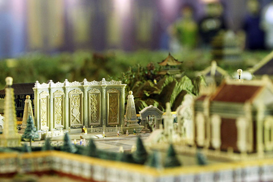 5月4日,游客在參觀縮微版“圓明園”。近日,一座“全景式巨型立雕圓明園”在上海世博會世界貿易中心協會館亮相。這座縮微版的“圓明園”以1比150的比例制作而成,再現了全盛時期的圓明園雄偉壯觀的全景。圖片來源:新華網 裴鑫 攝