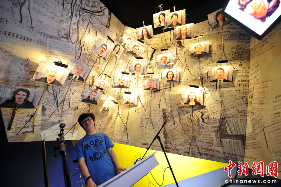 站在模擬“唱詩班”前,游客也可以高歌一曲。中新網記者 王紅綱 攝