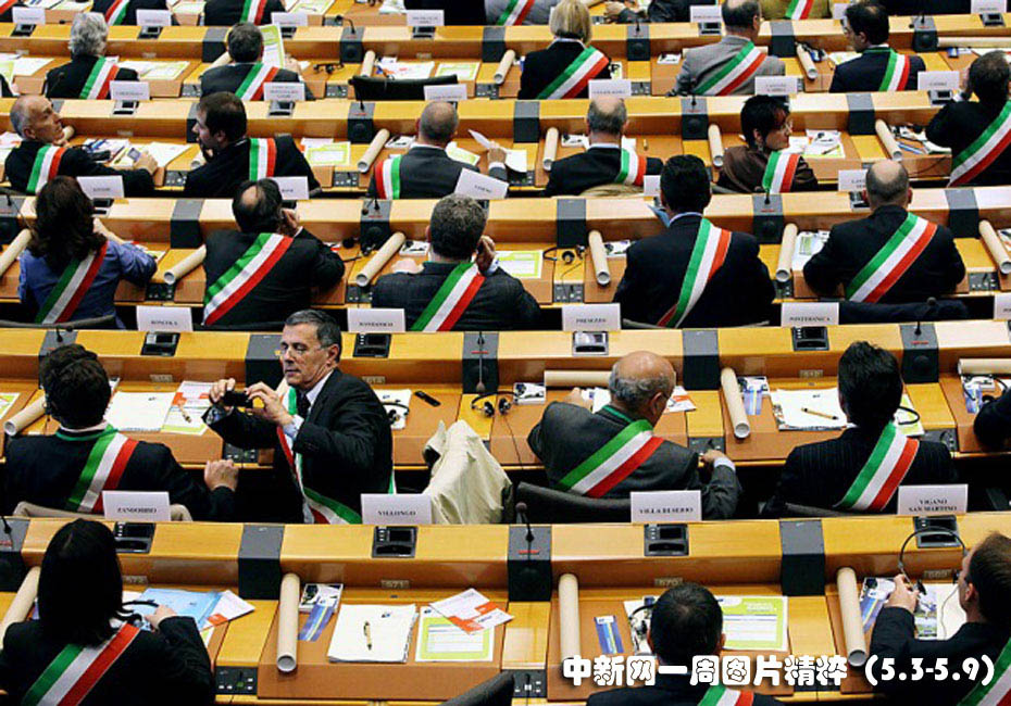 5月4日周二,在布魯塞爾召開的歐洲議會(huì)市長(zhǎng)會(huì)議上,一名市長(zhǎng)為同事們拍照。