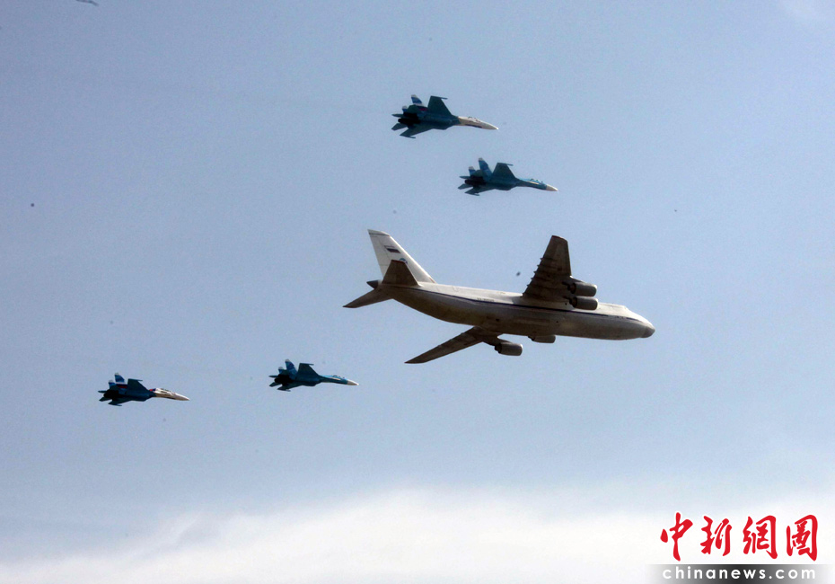 5月9日,俄羅斯在莫斯科紅場舉行盛大的閱兵式,慶祝衛國戰爭勝利65周年。莫斯科時間5月9日上午10點(北京時間9日下午2點)許,閱兵式正式開始。圖為空中梯隊穿越紅場上空接受檢閱。張朔 攝