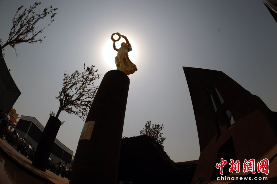 圖為盧森堡館外的“金色少女”。中新社記者 廖攀 攝