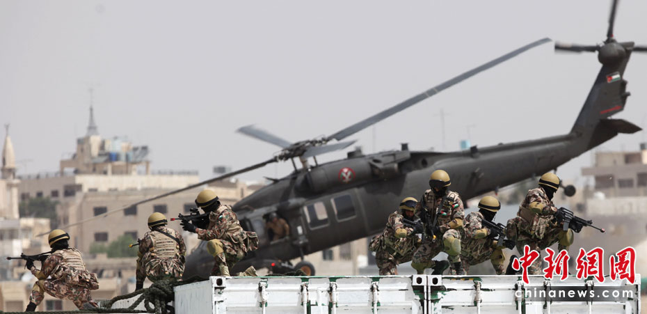5月11日,約旦特種部隊在安曼空軍基地附近舉行演習,為特種作戰部隊展覽會(SOFEX)開幕式助興。該展覽會為期4天,展覽主題包括國家安全及反恐措施。圖片來源:中國新聞網