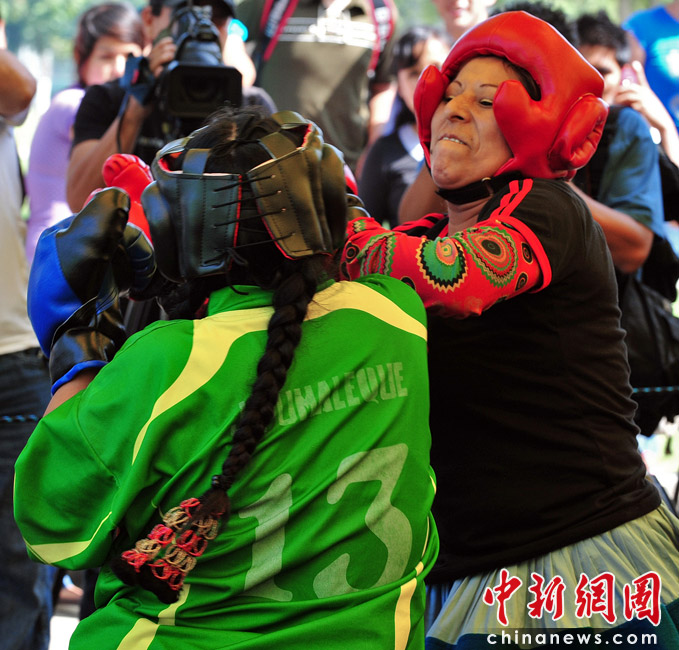 5月13日,秘魯利馬高地舉辦的傳統(tǒng)食品博覽會(huì)上,兩名安第斯農(nóng)民婦女穿著象征秘魯和玻利維亞的裙子同臺(tái)搏擊妙趣橫生。圖片來源:中國(guó)新聞網(wǎng)