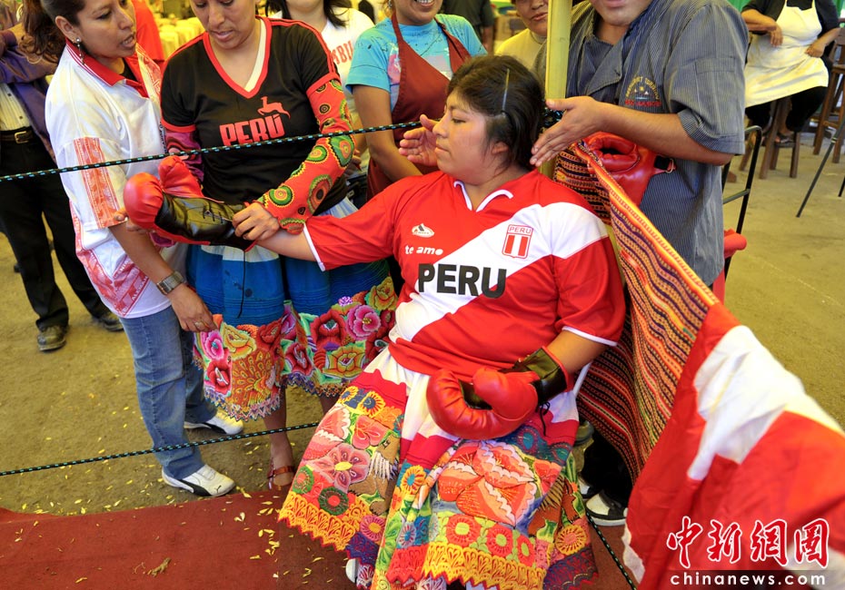 5月13日,秘魯利馬高地舉辦的傳統食品博覽會上,兩名安第斯農民婦女穿著象征秘魯和玻利維亞的裙子同臺搏擊妙趣橫生。圖片來源:中國新聞網