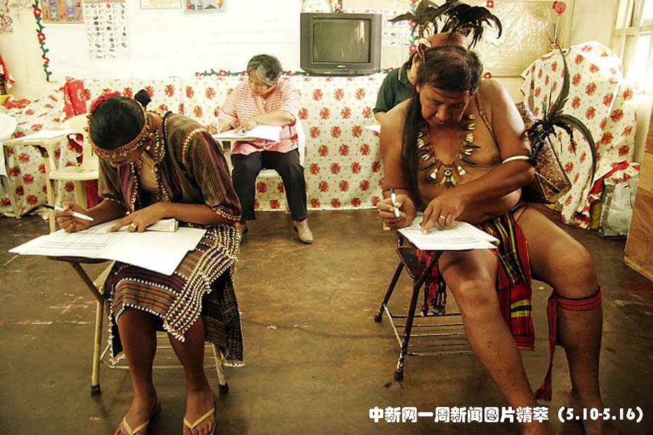 周一(10日),在菲律賓碧瑤市,身著傳統服裝的伊哥洛原住民老者尼古拉•卡沃德(Nicholas Cawed,右),和女兒米亞·尼古拉·卡沃德(Mia Nichole Cawed)填寫總統選票。