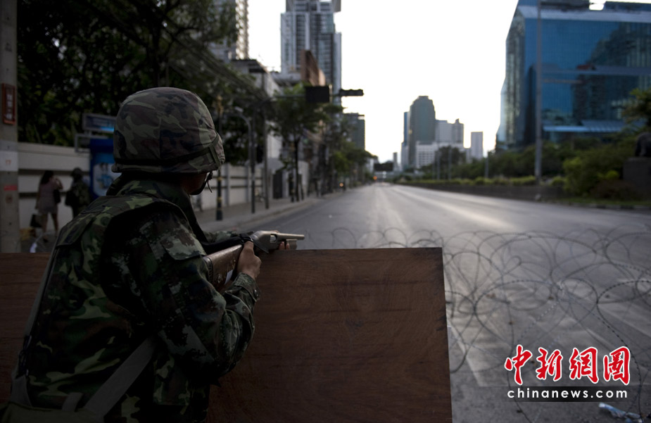 泰國軍隊和反政府的“紅衫軍”16日繼續(xù)在曼谷的多處地點對峙,槍聲和爆炸聲不時響起,曼谷的部分街道已成為“戰(zhàn)區(qū)”。泰國急救醫(yī)療部門17日表示,泰國軍警與反政府“紅衫軍”示威民眾3天來在曼谷街頭爆發(fā)的沖突,死亡人數(shù)已經(jīng)上升到35人。圖片來源:中國新聞網(wǎng)