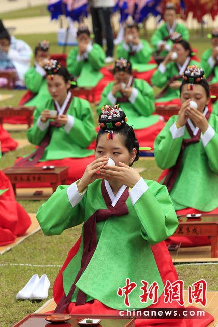 5月17日,韓國首都首爾慶熙宮舉行了第38屆成人禮儀式。為了慶祝青年人年滿20歲,同時也為了提高他們身為成人的責任感。圖為韓國少女在成人儀式上喝酒。圖片來源:中國新聞網