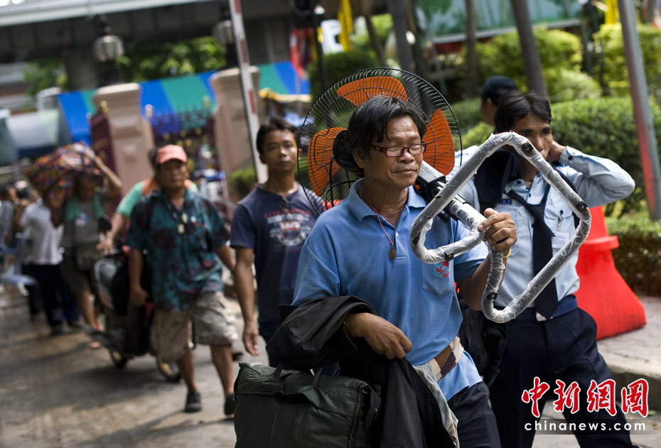 5月20日,數千名結束集會的外地“紅衫軍”示威者在曼谷拉差巴頌地區接受登記和安全檢查后,乘坐政府安排的車輛返回家鄉。