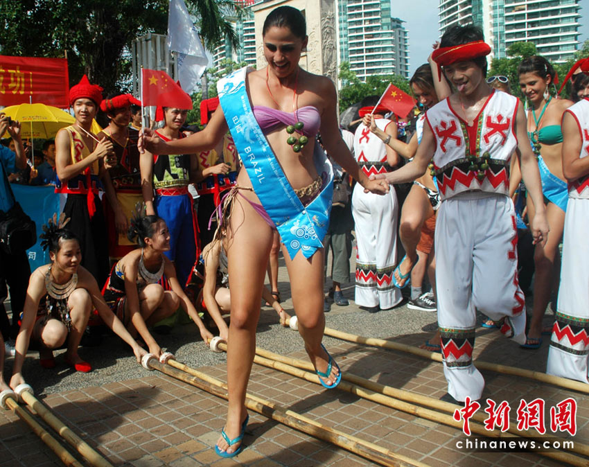 5月23日,全球64位比基尼佳麗們參加了三亞“清涼一夏 文化三亞”夏季旅游促銷活動的啟動儀式及系列主題活動,與三亞市民和游客親密接觸,跳起了歡快的竹竿舞,并乘豪華游艇暢游三亞。中新社記者 尹海明 攝