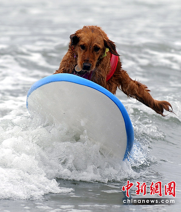 5月22日,美國加利福尼亞州圣迭戈舉行了一場妙趣橫生的狗狗沖浪比賽。圖片來源:中國新聞網