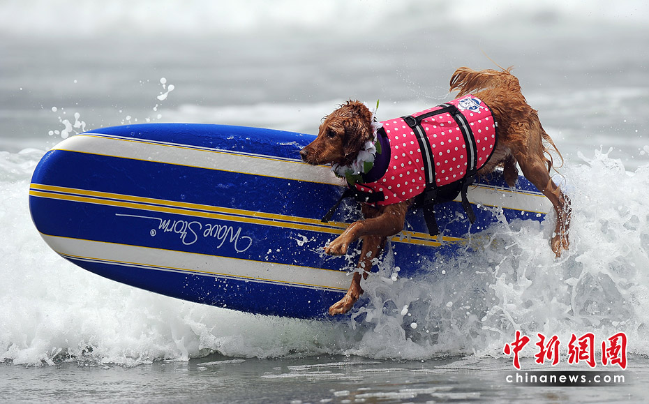 5月22日,美國加利福尼亞州圣迭戈舉行了一場妙趣橫生的狗狗沖浪比賽。圖片來源:中國新聞網
