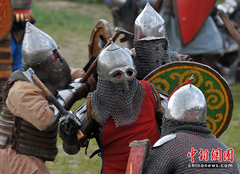 5月22日,在烏克蘭基輔郊區舉行的基輔羅斯節表演上,演出者再現了十三世紀的基輔羅斯戰役歷史場面。圖片來源:中國新聞網