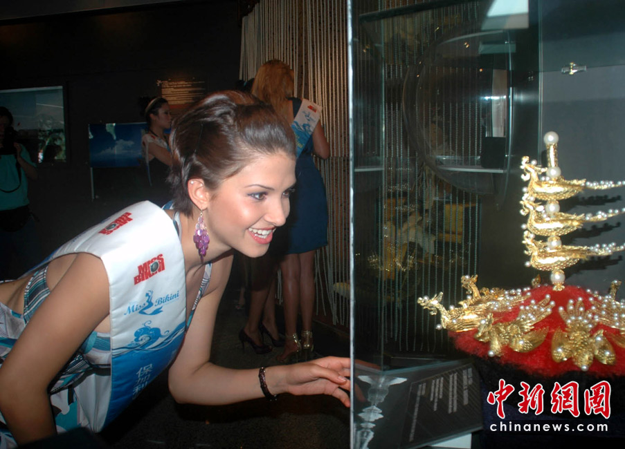 5月24日,海南三亞,正在此間參加第35屆國(guó)際比基尼小姐全球總決賽的64位佳麗,參觀了三亞一家珍珠博物館。佳麗們對(duì)漂亮的珍珠十分鐘愛,在攝影師前擺出各種“POSE”,留下美麗身影。圖為佳麗對(duì)漂亮的中國(guó)清朝時(shí)期皇后的皇冠(仿制品)興趣濃厚。 中新社記者 尹海明攝