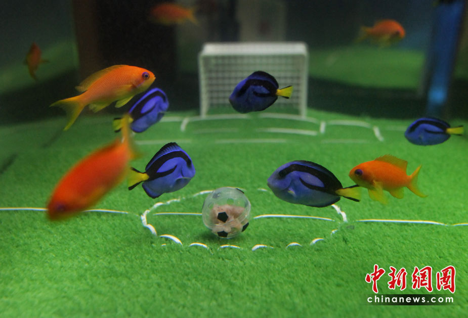 5月23日,日本橫濱八景島海洋世界水族館中,一群魚兒在“踢足球”,藍色魚代表日本隊,橘色魚代表荷蘭隊。在2010年南非“世界杯”上,日本將迎戰荷蘭隊。